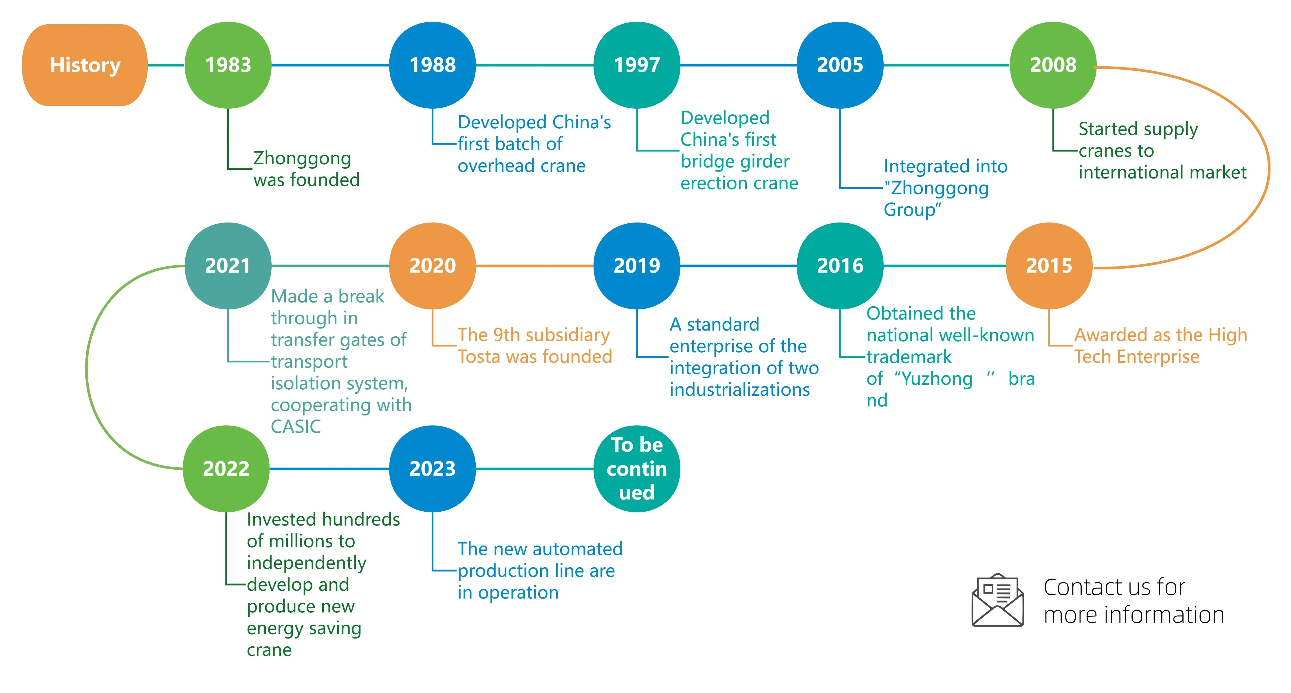 With the past years' technological innovation, we are the member unit of Bridge Crane branch of "China Heavy Machinery Industry Association". Meanwhile Zhonggong is the first crane manufactures in China to be certified to GB/T19001-2000/ISO9001: 2000, GB/T 24001-2004/ISO14001: 2004, and GB/T28001-2001/OHSAS18001: 2007 standards. Brand "YUZHONG" products have been granted titles such as "Top 10 brand Well-Known Cranes in China", "Well-Known Commodity in Henan Province" and "Henan Famous Trademark".